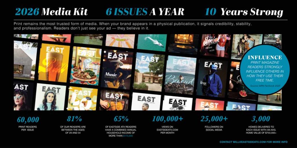 For 10 years, EASTside Magazine has helped local businesses show up where Austin readers are actually paying attention. We connect brands with an engaged, high-trust audience through beautifully curated print issues, eastsideatx.com, social media, e-newsletters, and story-driven sponsored content. Whether you want more visibility, stronger local awareness, or a custom campaign that feels true to your brand, we’ll help you build the right mix.