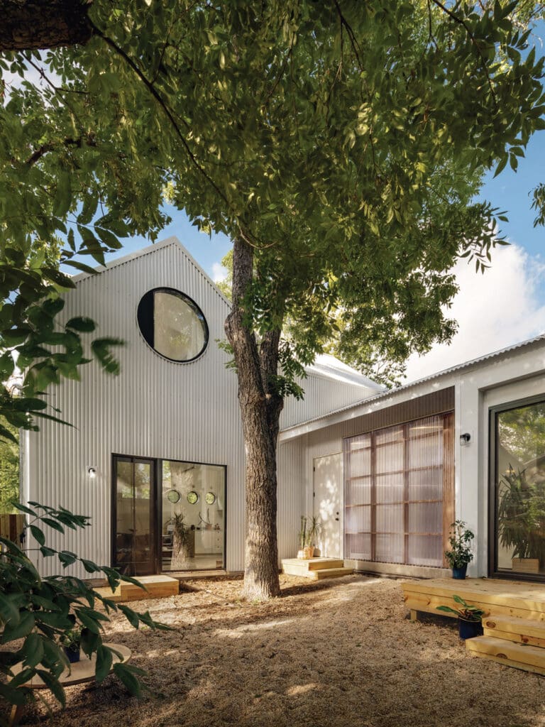 The site, accessible by alley, was hemmed in by protected pecan trees, with zoning that capped the buildable footprint at under 900 square feet. Lacking an extravagant budget, the question became how to design a home that didn’t feel like a compromise.