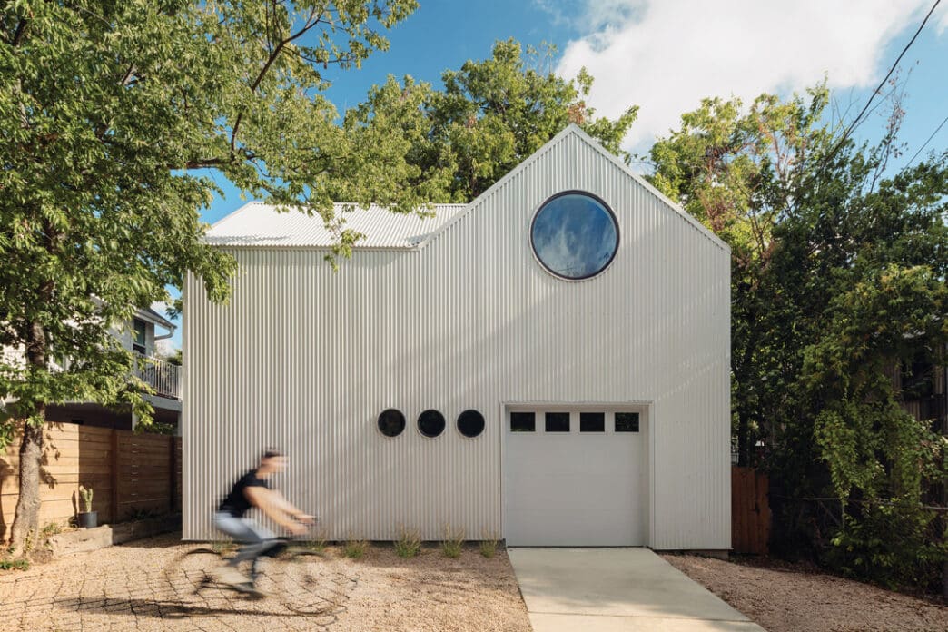 Clad entirely in corrugated metal, the home borrows a language of modest utility; yet its simple gabled form and large, round porthole windows lend it a playfully elevated curb-appeal. The designers resisted trends, instead pursuing proportion, rhythm, and practical detailing instincts that served both budget and ease of construction.