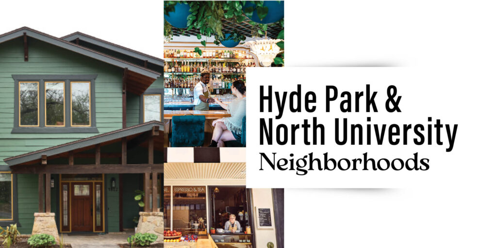 With its leafy streets lined by Craftsman bungalows and stately Victorian homes, Hyde Park and North University feel like a love letter to old Austin, where front porches still matter and history quietly hums in the background. Developed in the late 1800s as one of the city’s first streetcar suburbs, this neighborhood has long balanced academia, activism, and everyday living with ease.