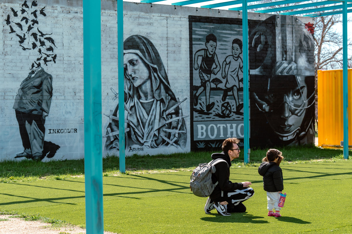 The original gallery on Baylor Street was meant to last three to five years. Those years taught Andi about the value of her vision. “The platform proved it was useful and beneficial to outdoor artists, but it also, more importantly, proved that people would show up for all kinds of reasons,” she says. In a single day, she recalls a family filming a music video for a grandmother, another doing a photoshoot for their Easter card, a group of tap dancers, a carload of break dancers—all utilizing the walls alongside artists and art lovers. It occurred to Andi that there was no other place like this in the country (especially after the demolition of Long Island City, New York’s famous 5 Pointz graffiti park, in 2014).