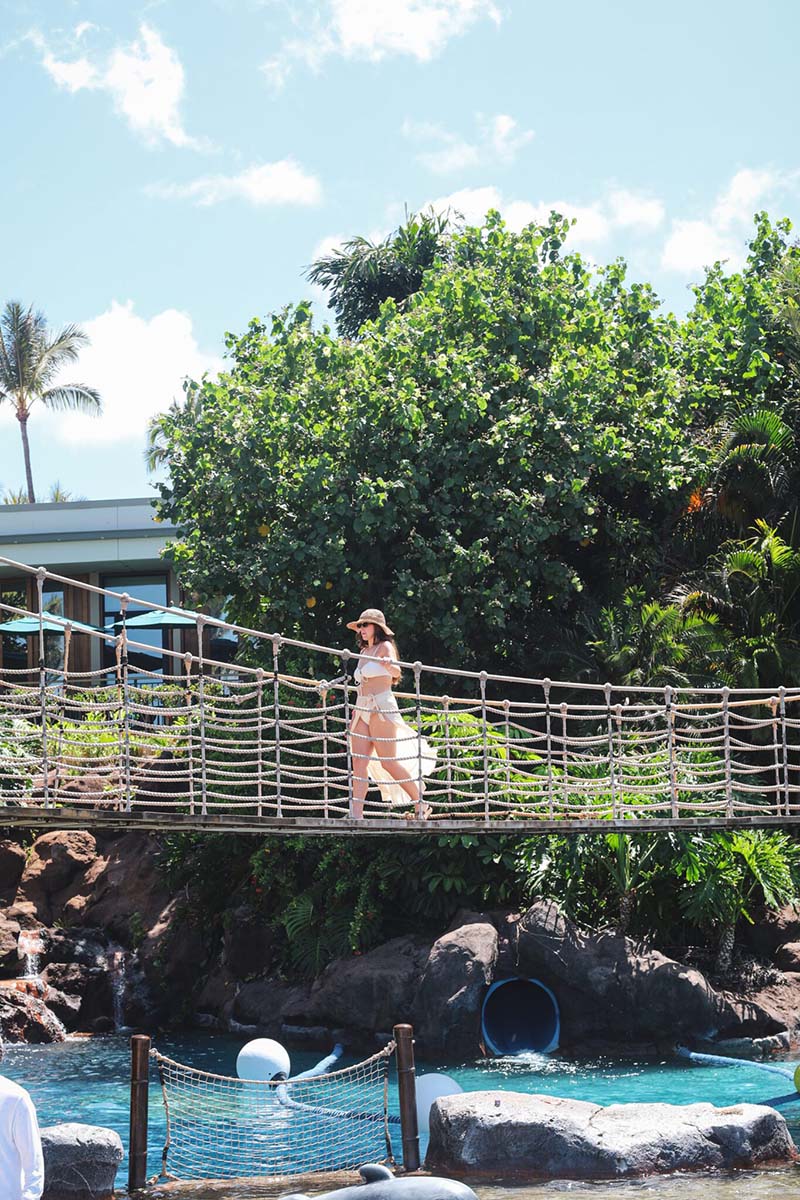 Pathways and bridges wind past waterfalls and over koi-filled ponds. Pools snake through cascades, and waterslides curl into lagoons. Cabanas dot the shoreline like little islands of rest, and the whisper of ukuleles float through the palms. Somewhere nearby, someone is being handed a chilled coconut. Somewhere else, a goose is likely winning a standoff with a tourist.
